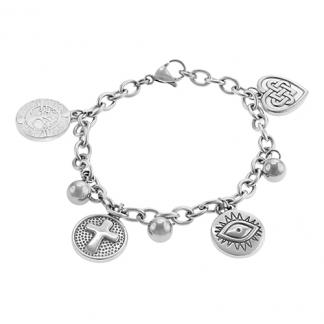 STAINLESS STEEL BRACELET WITH 4 CHARMS IN DIFFERENT DESIGNS AND 3 STEEL BALL IN 8MM. THE HANGING CHARMS SIZES FROM 12MM-18MM WIDTH