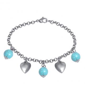 STAINLESS STEEL CHARM BRACELET WITH 3 TURQUOISE BEAD WITH 2 LOVE HEART