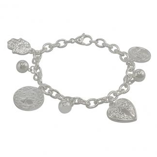 STAINLESS STEEL BRACELET WITH 4 CHARMS IN DIFFERENT DESIGNS AND 3 STEEL BALL IN 8MM. THE HANGING CHARMS SIZES FROM 12MM-18MM WIDTH