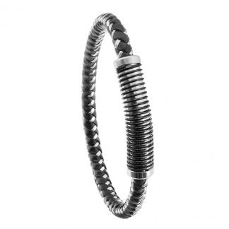 STAINLESS STEEL BRACELET WITH BLACK LEATHER AND WIRE.