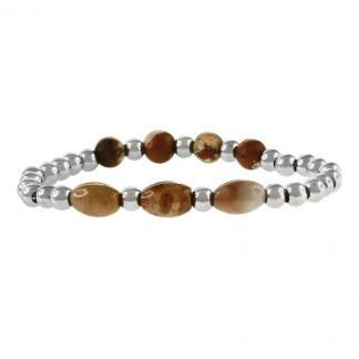 STAINLESS STEEL ELASTIC BRACELET WITH ROUND STEEL BALLS AND 3 CORALLITE & 4 ROUND MAP STONES