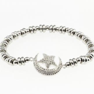 STANLESS STEEL ELASTIC BRACELET WITH STEEL BEADS AND ONE COPPER PENDANT WITH MOON& STAR WITH WHITE ZIRCON