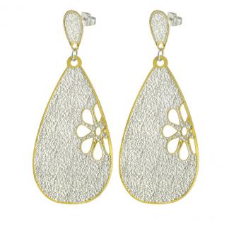 STAINLESS STEEL EARRINGS IN DROP SHAPE IN IPG TWO TONE WITH FLOWER CUT PATTERNIN IPG TWO TONES