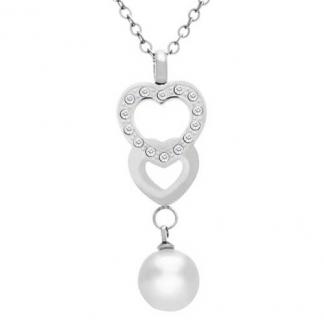 STAINLESS STEEL PENDANT NECKLACE ALL IN S/S WITH 2 HEART PENDANT WITH CZ WITH PERAL SPHERE