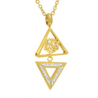 STAINLESS STEEL NECKLACE TWO TRIANGLES WITH A ROSE WITH CZ JOINED TOGETHER WITH A SMALL HOOP ALL IN IPG