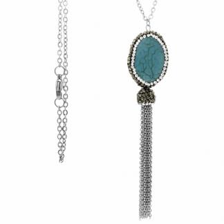 STAINLESS STEEL NECKLACE WITH TURQUOISE STONE WITH BLACK & WHITE CZ AND A CASCADE OF THING CHAINS S/S COLOR