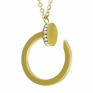 STAINLESS STEEL NECKLACEOPEN CIRCLE SHAPE WITH A DRUM LIKE END WITH CZ IN BLACK BACKGROUND IPG COLOR