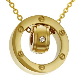 STAINLESS STEEL NECKLACE WITH CIRCLE PENDANT TWO WITH SCREW PATTERN AND CZ IN IPG COLOR.
