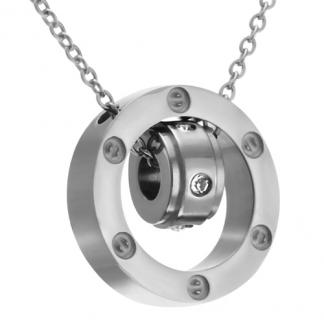 STAINLESS STEEL NECKLACE WITH CIRCLE PENDANT TWO WITH SCREW PATTERN AND CZ IN S/S COLOR.