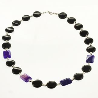 STAINLESS STEEL NECKLACE WITH FLAT ROUND BLACK ONYX AND 4PCS OF BLUE AGATE STONES&WITH ROUND STEEL BALLS