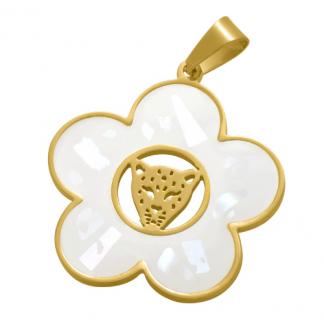 STAINLESS STEEL PENDANT IN FLOWER SHAPE WITH PATHER FACE WITH WHITE ENAMEL WITH COLORFUL PIECES ALL IN IPG