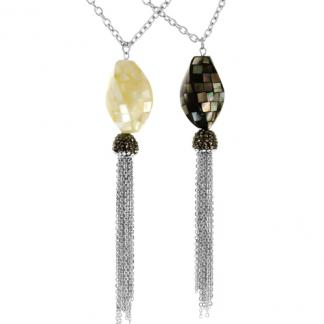 STAINLESS STEEL NECKLACE WITH PENDANT NATURAL STONE WITH A SQUARE PATTERN AND CRYSTAL BLACK & WHITE WITH THIN CHAIN IN CASCADE IN S/S COLOR