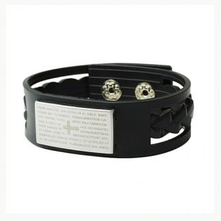STAINLESS STEEL BRACELET BLACK PU WITH CENTRE PLATE WITH CROSS & BIBLE VERSE