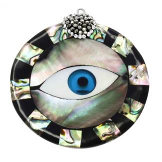 STAINLESS STEEL PENDANT IN CIRCULAR SHAPE WITH A PSYCHEDELIC DESIGN OF A EYE IN THE CENTER IN ENAMEL BLACK WITH BLACK & WHITE CZ ALL IN S/S IN SHELL