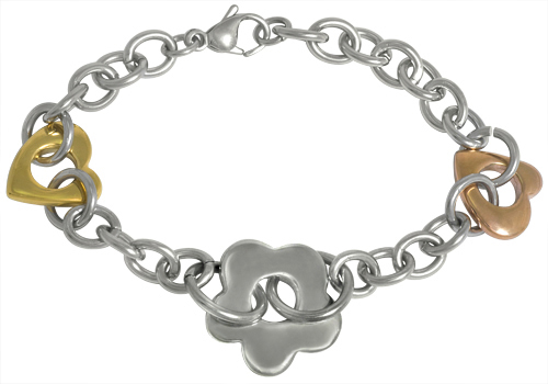 Stainless steel bracelet in IP Rose and IPG 3 tone with flower and heart