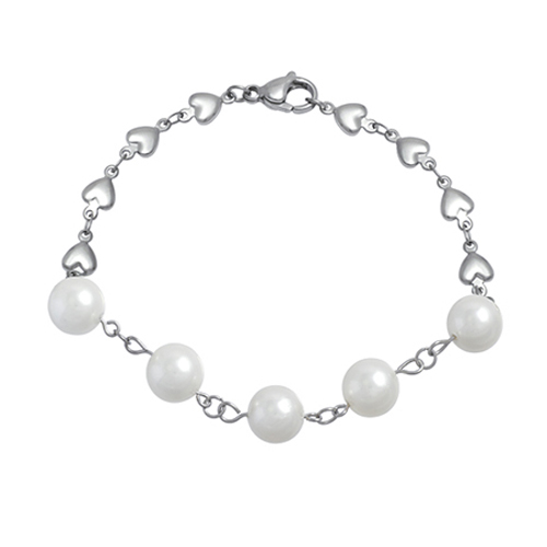 Stainless Steel Bracelet WITH 5 SYNTHETIC PEARLS OR STONES (BLUE OR PINK) WITH HEART CHAIN
