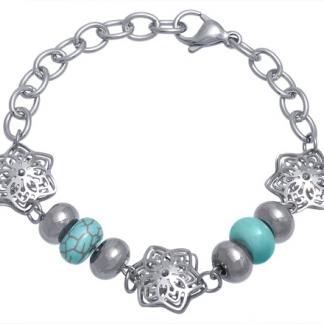 Stainless Steel Bracelet WITH 3 FLOWERS WITH CUT OUT PATTERN WITH S/S BEADS AND TURQUOISE STONE