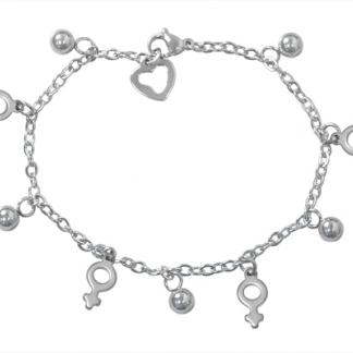 Stainless Steel Bracelet WITH 4 WOMAN GENDER SIGN CHARM & 5 S/S BEADS AND 1 HEART CHARM ALL IN STEEL COLOR