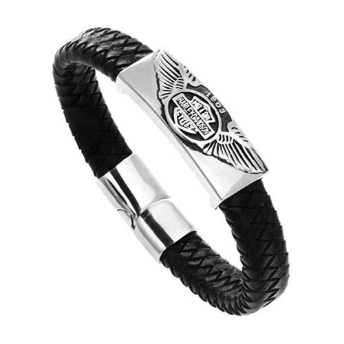 STAINLESS STEEL BRACELET IN BLACK PU WITH HARLEY DAVIDSON CENTER PLATE WITH S/S MAGNET BUCKLE