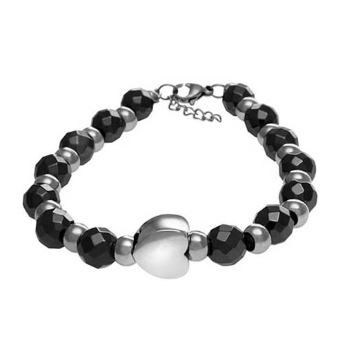 STAINLESS STEEL BRACELET WITH BLACK CRYSTAL BEADS WITH HEART CHARM IN CENTER