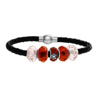 STAINLESS STEEL BRACELET WITH LEATHER & MAGNET LOCK WITH ROUND CZ PENDANT IN CENTER WITH TWO RED & TWO PINK CRYSTAL