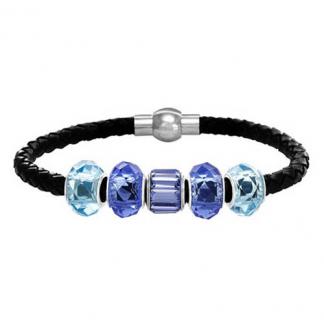 STAINLESS STEEL BRACELET WITH LEATHER & MAGNET LOCK WITH ROUND CRYSTAL PENDANT IN CENTER WITH TWO DEEP BLUE & TWO LIGHT BLUE CRYSTAL |
