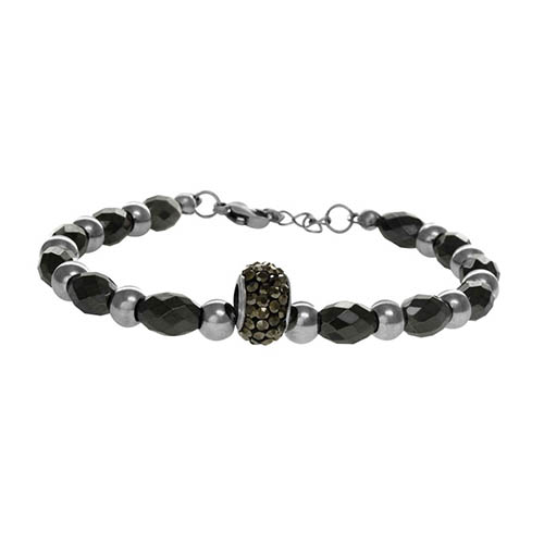 STAINLESS STEEL BRACELET WITH BLACK OVAL CRYSTAL & S/S BEADS AND ROUND CZ PENDANT IN CENTER