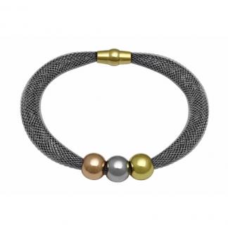 STAINLESS STEEL WITH MESH TUBE FILLED WITH CRYSTALS WITH MAGNET LOCK & 3 BEADS IN S/S & IPG & IPR 3 T0NE