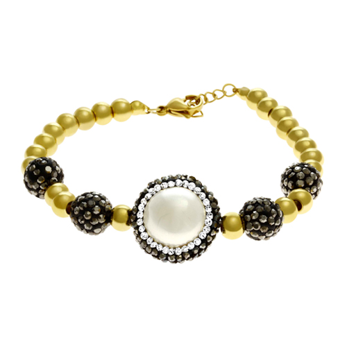 STAINLESS STEEL BRACELET ALL IN IPG COLOR WITH 1 PEARL IN THE CENTER AND CRYSTAL AROUND WITH 4 SPHERES IN CRYSTAL .