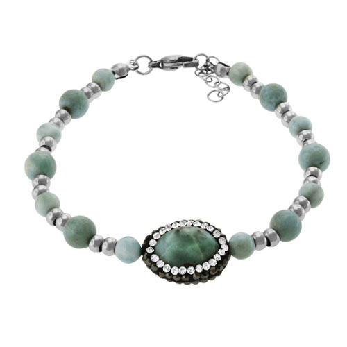 STAINLESS STEEL BRACELET WITH LARIMAR STONE AND ONE LARIMAR PENDANT IN THE CENTRE