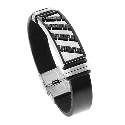 STAINLESS STEEL BRACELET WITH BROWN LEATHER. THE ID PLATE IN IPB TWO TONE