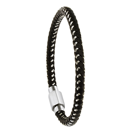 STAINLESS STEEL BRACELET WITH BLACK LEATHER WITH WIRE IN SS COLOR WITH MAGNET LOCK