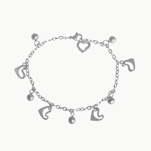 Stainless steel bracelet with 4 heart charms and 5 beads and a closing heart charm |