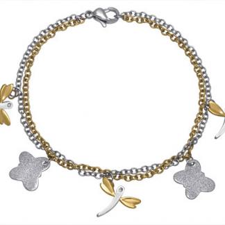 Stainless Steel Bracelet WITH DOUBLE CHAIN IN IPG TWO TONE WITH 3 DRAGONFLY CHARM WITH CZ WITH 2 SANDBLAST BUTTERFLY CHARM |