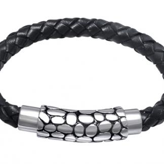 Stainless Steel Bracelet WITH BLACK LEATHER WITH STAINLESS STEEL PIECE (ANIMAL SKIN-LIKE PATTERN) WITH MAGNET LOCK