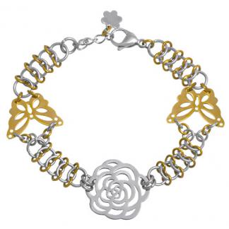 Stainless Steel Bracelet WITH 1 ROSE & 2 BUTTERFLY WITH CUT OUT PATTERN WITH FLOWER CHARM