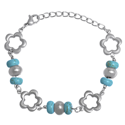 Stainless Steel Bracelet WITH 4 FLOWERS WITH 3 SETS OF TURQUOISE STONE & S/S BEADS