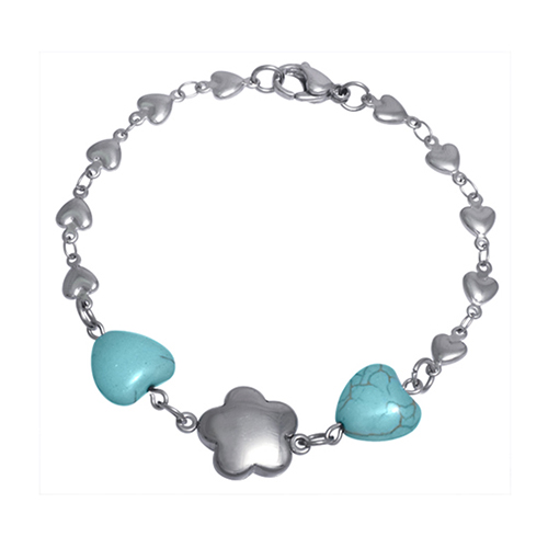 Stainless Steel Bracelet WITH HEART CHAIN WITH 1 FLOWER IN THE MIDDLE WITH 2 HEART SHAPE TURQUOISE