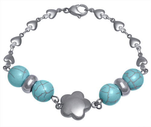 Stainless Steel Bracelet WITH HEART CHAIN WITH 1 FLOWER IN THE MIDDLE WITH 2 SETS OF TURQUOISE STONE & S/S BEADS |
