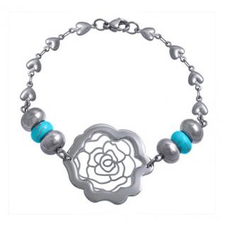 Stainless Steel Bracelet WITH ROSE PIECE WITH CUT OUT WITH 2 SETS OF TURQUOISE STONE & S/S BEADS WITH HEART CHAIN