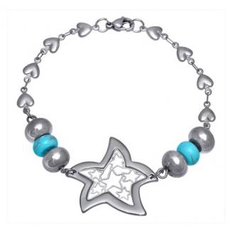 Stainless Steel Bracelet WITH STAR PIECE WITH CUT OUT WITH 2 SETS OF TURQUOISE STONE & S/S BEADS WITH HEART CHAIN
