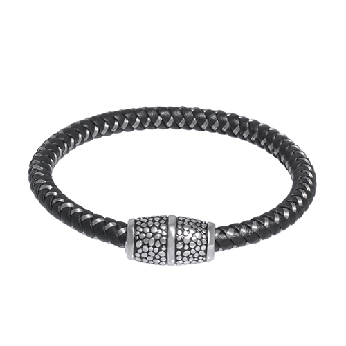 STAINLESS STEEL BRACELET WITH BLACK LEATHER WITH WIRE IN SS COLOR WITH MAGNET LOCK