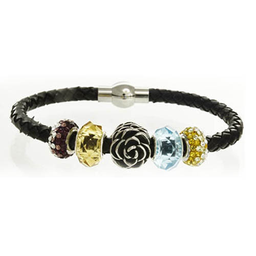 STAINLESS STEEL BRACELET WITH LEATHER & MAGNET LOCK WITH ROSE BEAD WITH 2 ROUND CZ PENDANT WITH BLUE & YELLOW CRYSTAL