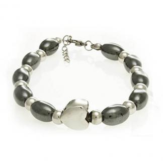STAINLESS STEEL BRACELET WITH OVAL BLACK BEADS & S/S CHAIN WITH HEART CHARM IN CENTER