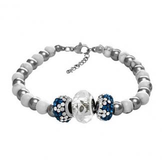 STAINLESS STEEL BRACELET WITH WHITE BEADS & S/S BEADS 2 PATTERN AND WHITE CRYSTAL AND 2 ROUND CZ PENDANT