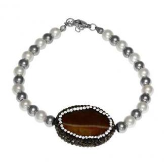 STAINLESS STEEL BRACELET WITH BROWN STONE CENTE PIECE WITH BLACK & WHITE CZ AROUND IT & ALTERNATED PEARLS & S/S BEADSS/S COLOR