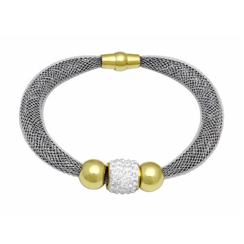 STAINLESS STEEL WITH MESH TUBE FILLED WITH CRYSTALS WITH MAGNET LOCK & 2 ROUND BEADS IN IPG WITH WHITE CZ ROUND CHARM IN S/S & IPG 2 T0NE