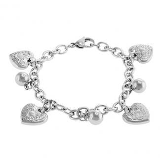 STAINLESS STEEL CHARM BRACELET WITH HEART CHARMS.