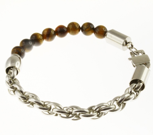 STAINLESS STEEL TIGER EYES BEADS & CHAIN BRACELET ALL IN S/S COLOR