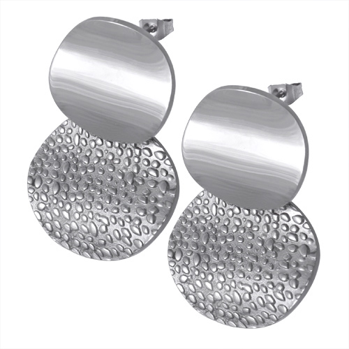 STAINLESS STEEL DROP EARRING WITH 2 CURVY CIRCLE PIECE ONE POLISH ONE WITH TEXTURE (HAMMERED) ALL IN STEEL COLOR